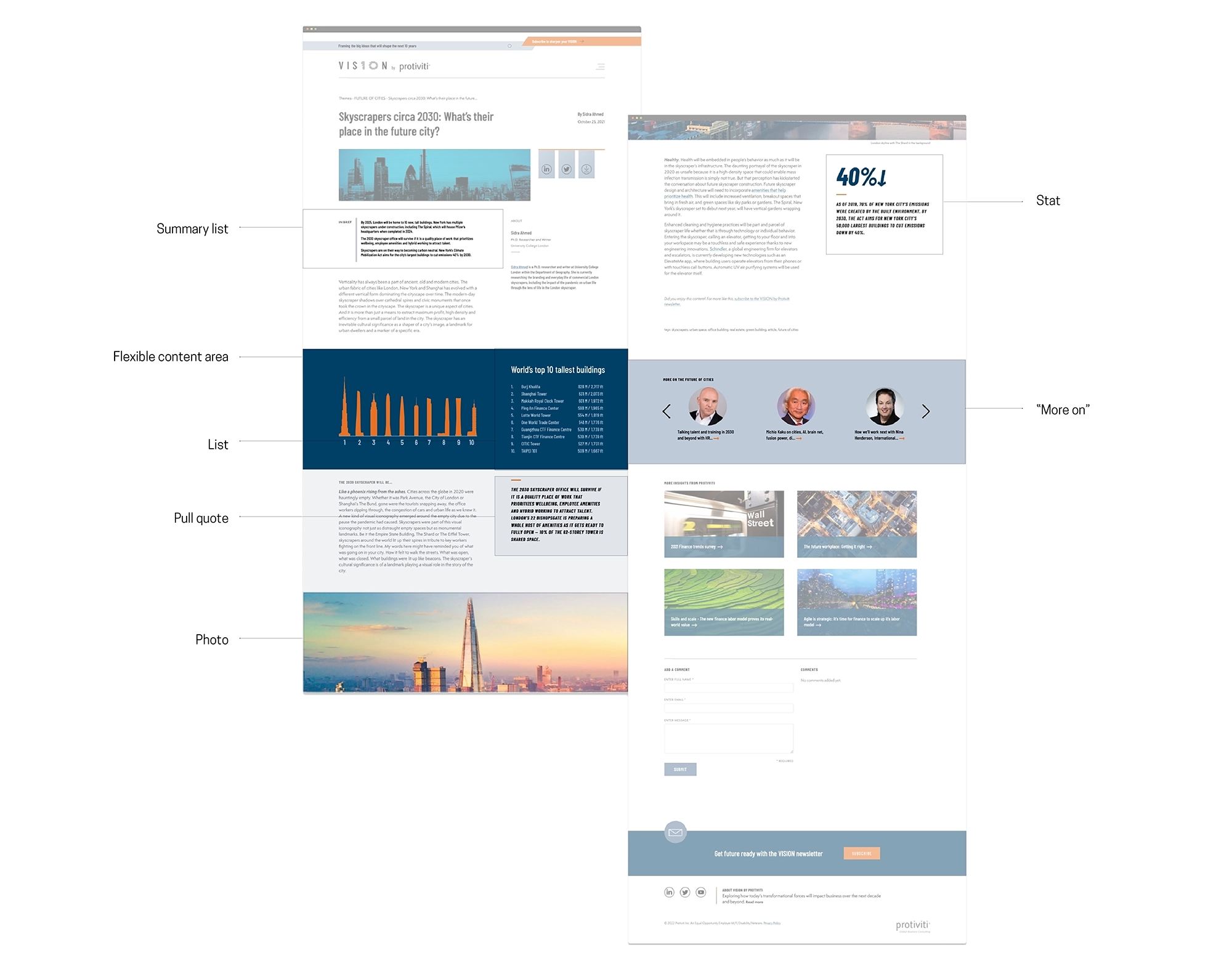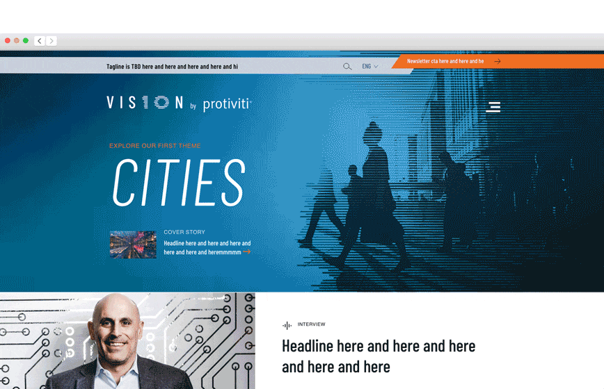 Protiviti, a consulting firm of nearly $2B annually, sought an editorial site exploring big, transformational topics that will alter business over the next 10+ years. As the sole product designer and brand designer on the project, I was entrenched from day 1 — from overseeing the Information Architecture and wireframing to building out the brand and getting the aforementioned presented and approved by all stakeholders including Protiviti's C-suite.